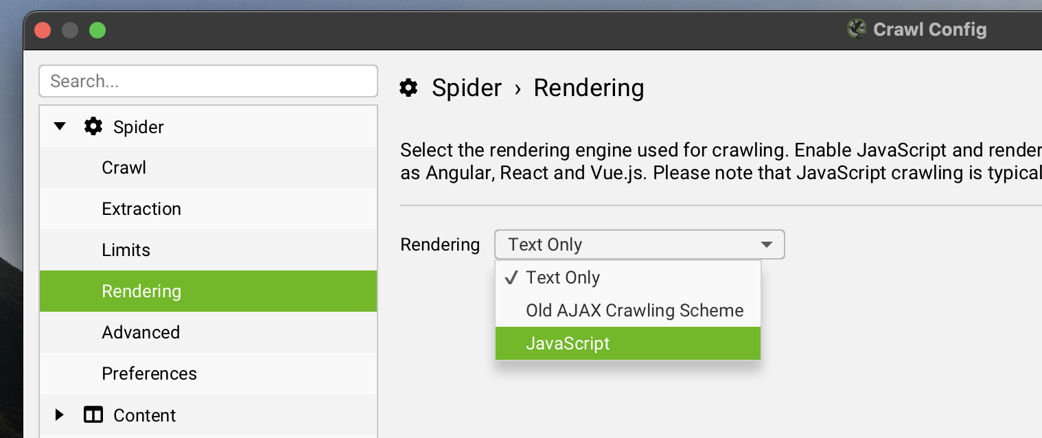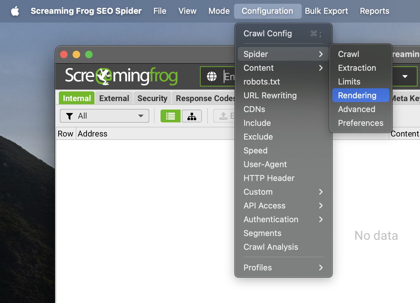 To start, though, you’ll need to enable JavaScript rendering. Go to Configuration > Spider > Rendering to find the menu