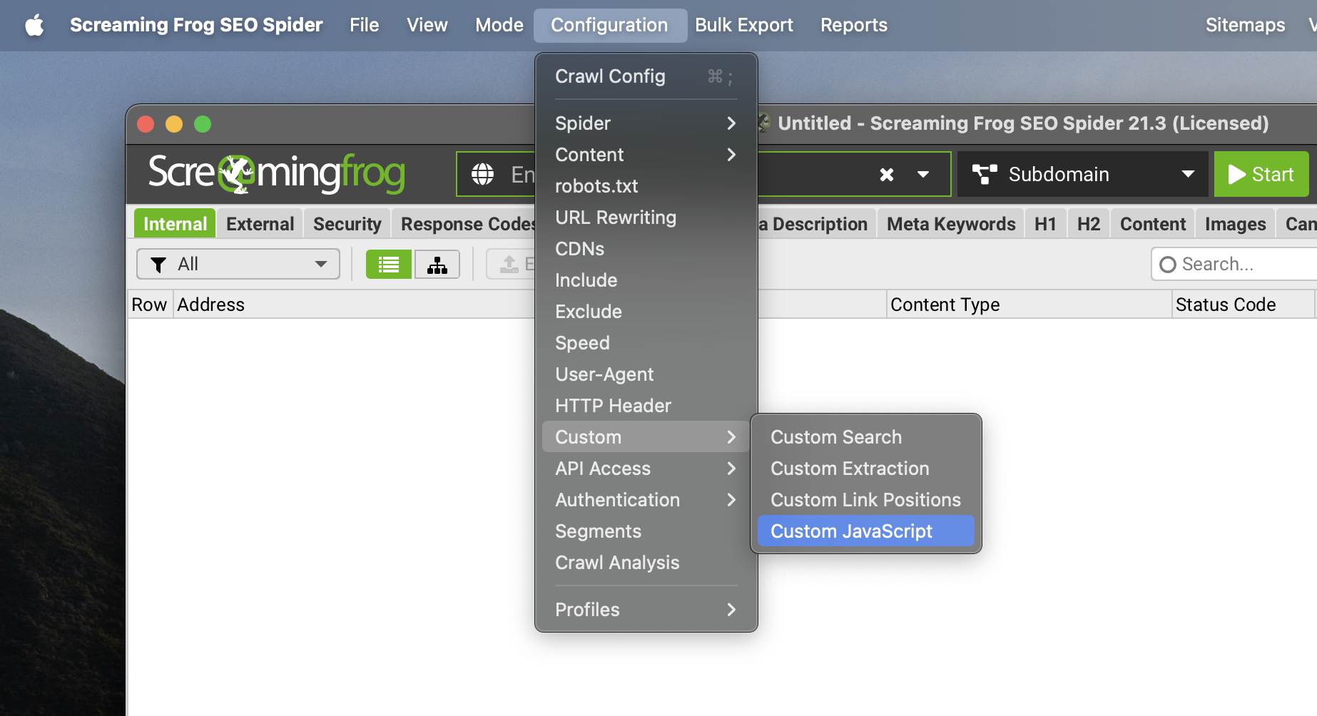 Now it’s time to get into the code! Don’t worry, it’s very minimal. From the Crawl config window select Custom > Custom JavaScript or from the top bar select Configuration > Custom > Custom JavaScript.