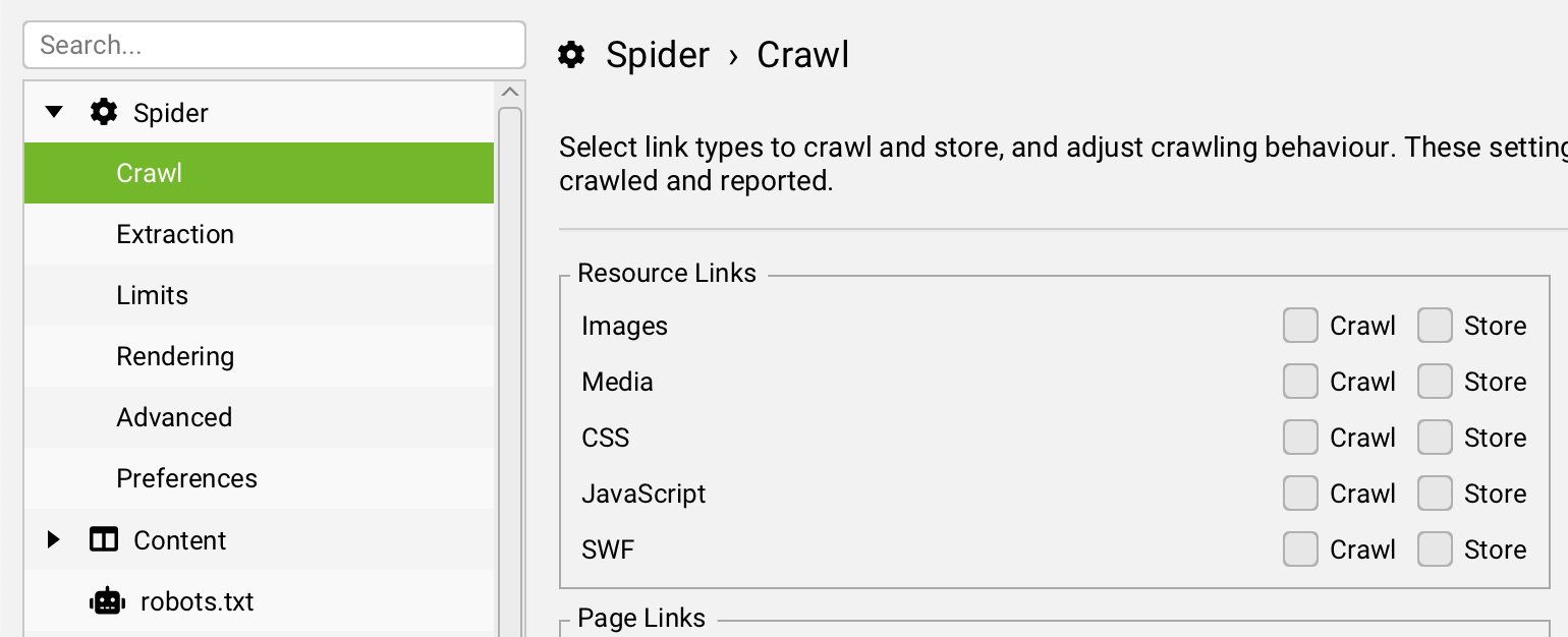 First, navigate to Configuration > Spider > Crawl and uncheck all of the resource links. You aren’t going to write meta descriptions for the JavaScript or CSS files on your site, and they’re going to clutter up your exports and lead to unnecessary API calls.