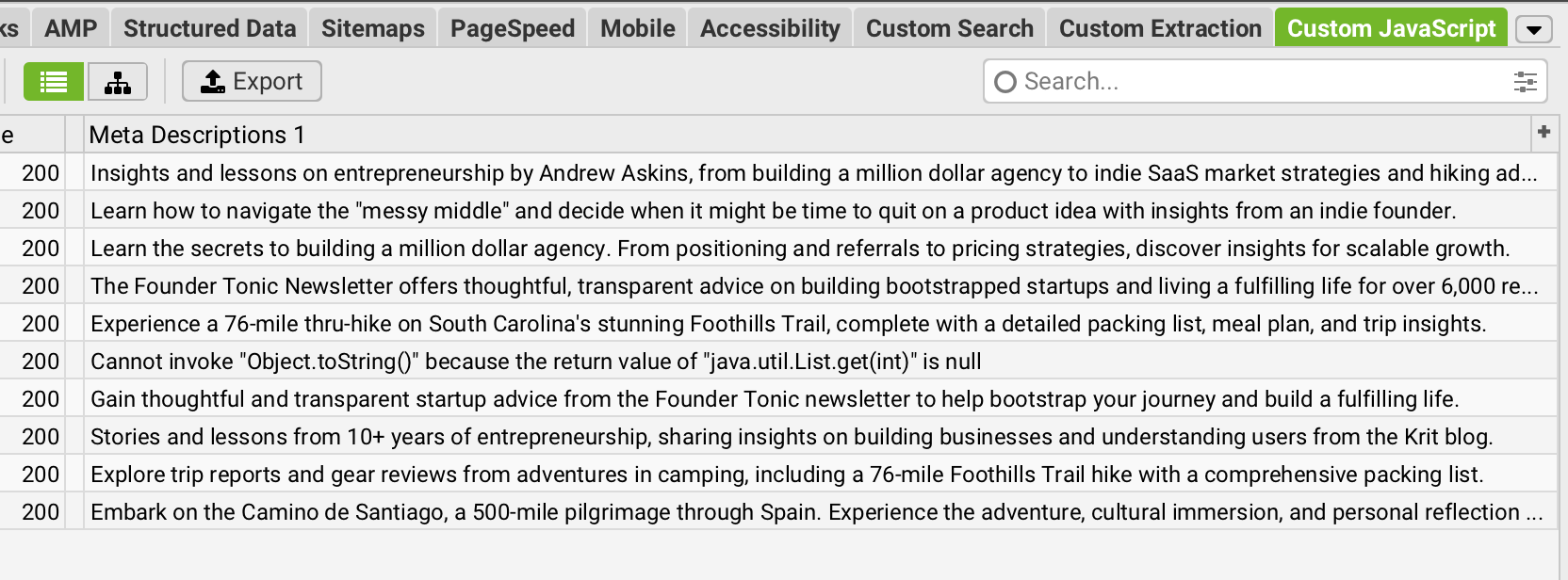Now when you run a crawl and navigate to the Custom JavaScript tab you’ll get a custom Meta Description generated by GPT 4o for every page on your site!