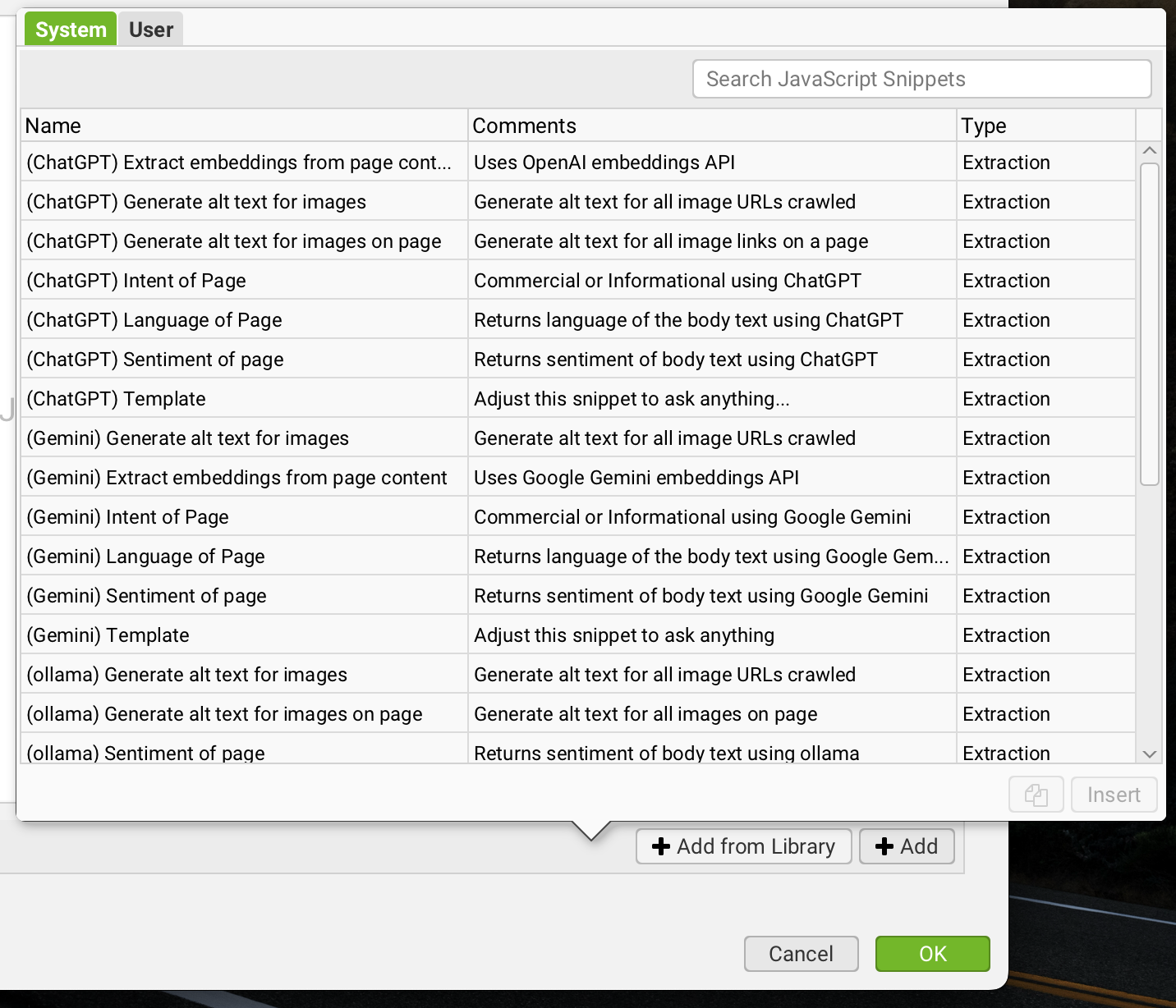 The way that you integrate Screaming Frog with generative AI tools (or any external API) is through Screaming Frog’s new Custom Javascript feature, which will run a little JS snippet on every page.
