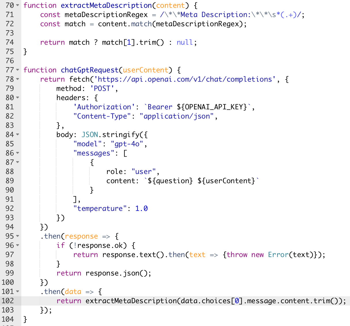 Last, we want to add a little bit of code to extract just the meta description from the AI’s response. In our prompt, we instruct the AI to first identify the primary keyword and to include that in the response. Doing so is a simple version of “thinking out loud” which helps to improve the quality of the response. But we likely just want the description.