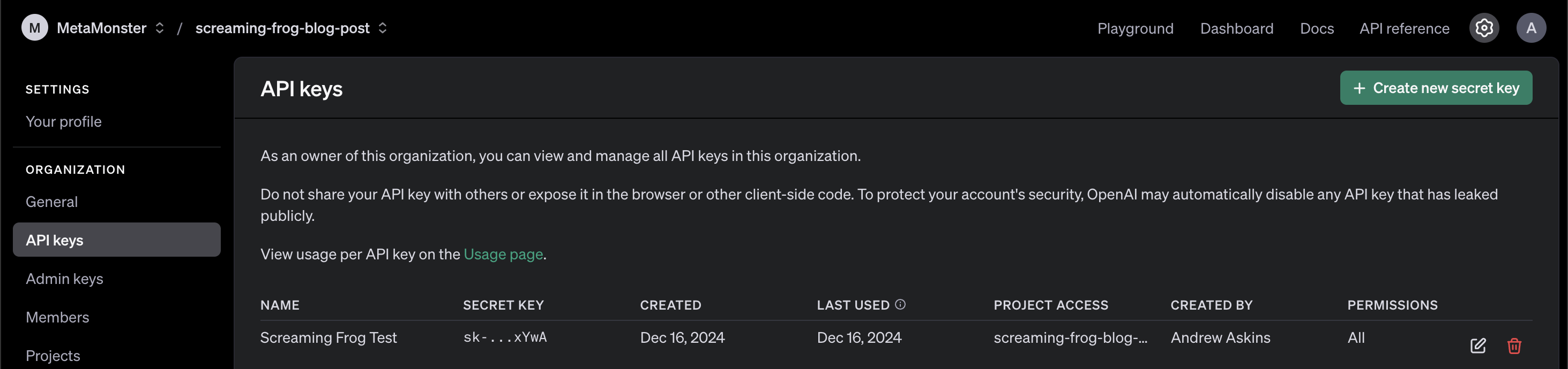 For security reasons, this key will be hidden after you close the modal, so copy it directly into Screaming Frog or into a note on your computer temporarily.