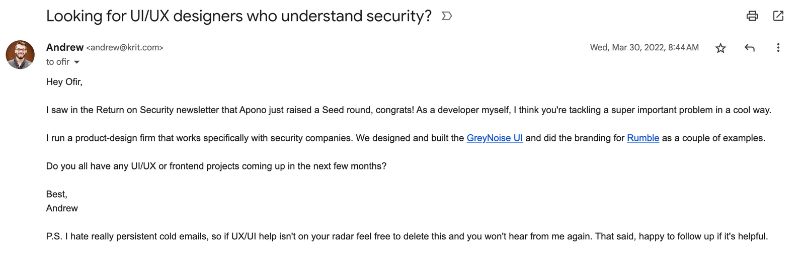 At Krit, we started off as a generic dev shop, building websites, mobile apps, anything for anyone. Then over time we narrowed down to a horizontal position - app development for nontechnical startup founders. But we started getting more and more referrals for product design work with security companies.